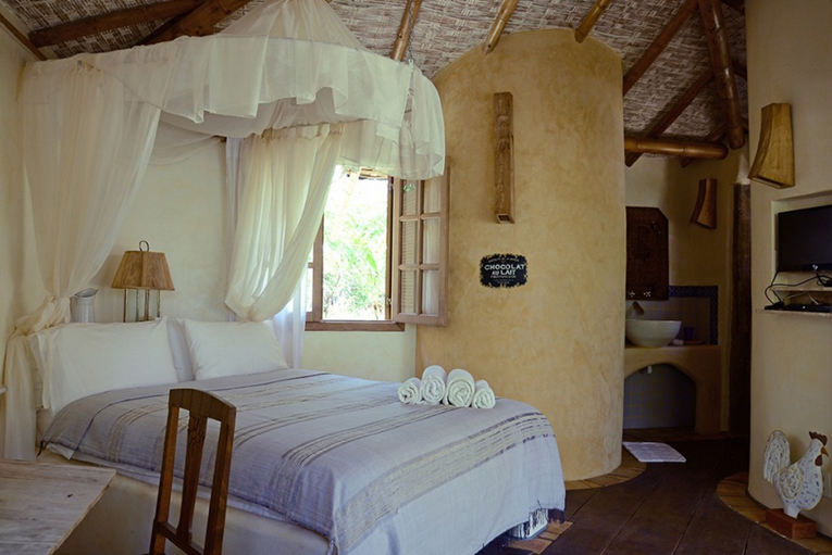 ESMERALDA possui um lindo jardim particular, iluminação aconchegante e é decorado em madeira e mármore com moveis importados da franca e marroquina. O quarto possui uma cama queen size, uma varanda com vista para o jardim e para mata.