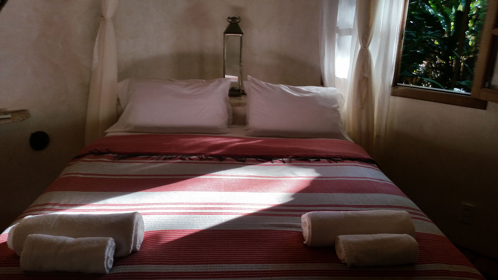 SARA é um bonito bangalô com tons agradáveis e naturais. Possui uma cama queen size e uma varanda compartilhada com o bangalô AGRA (quartos conectados), Os bangalôs SARA e AGRA podem ser reservados em conjunto para famílias.
